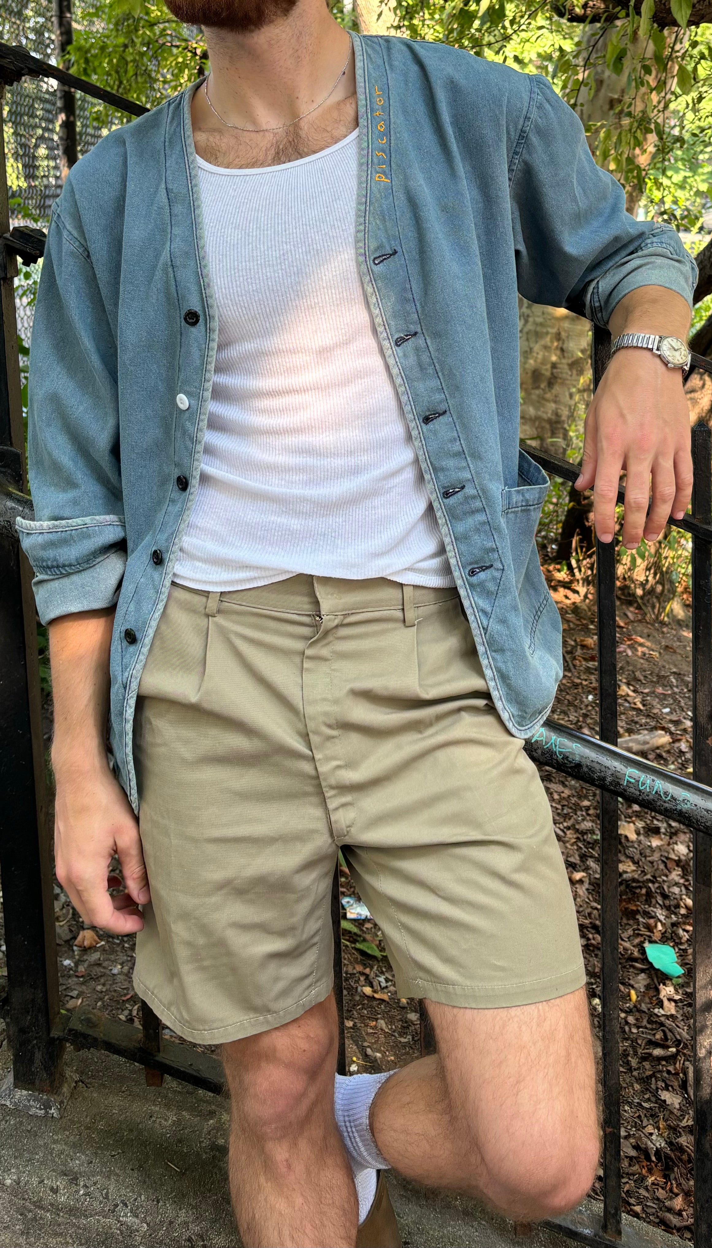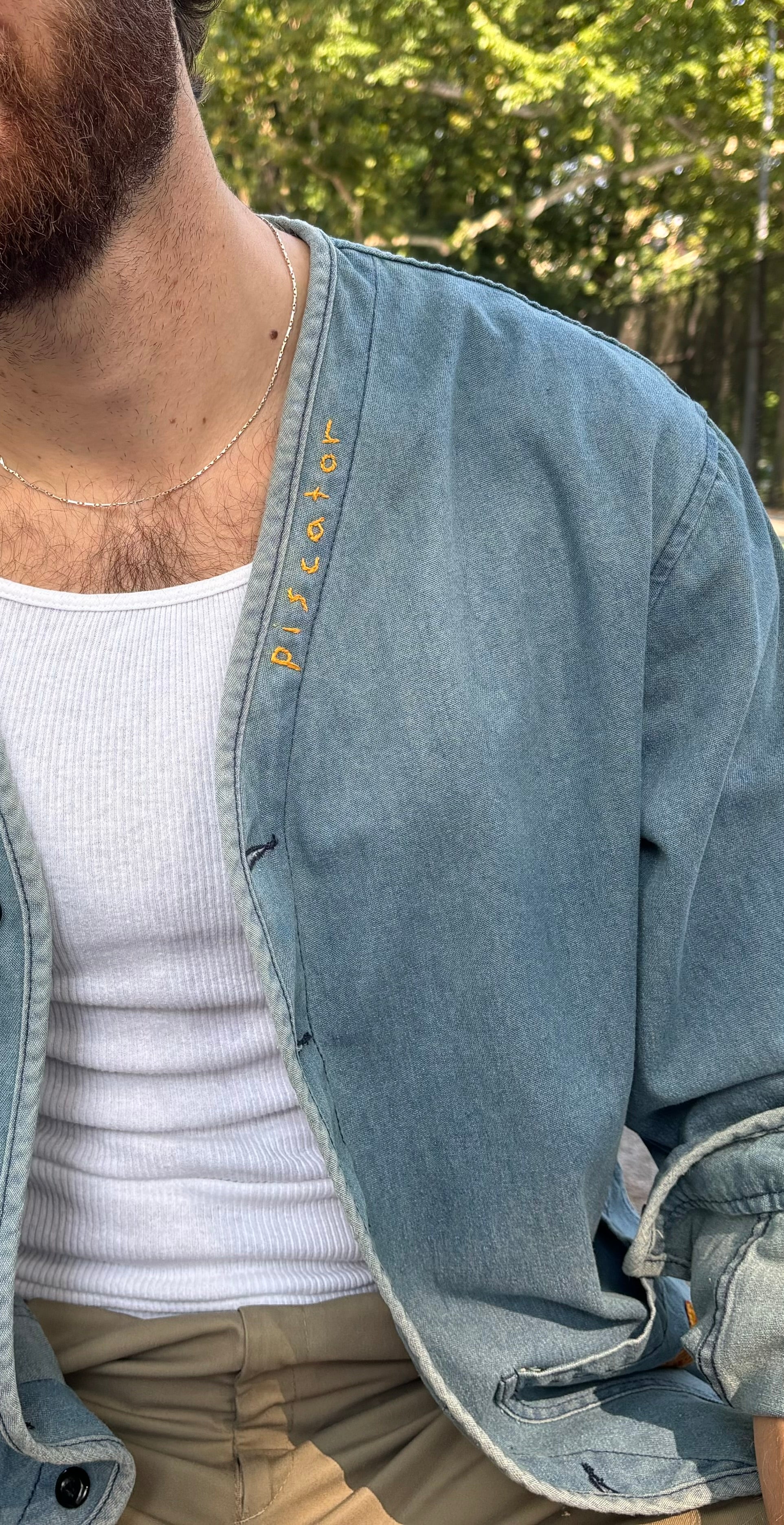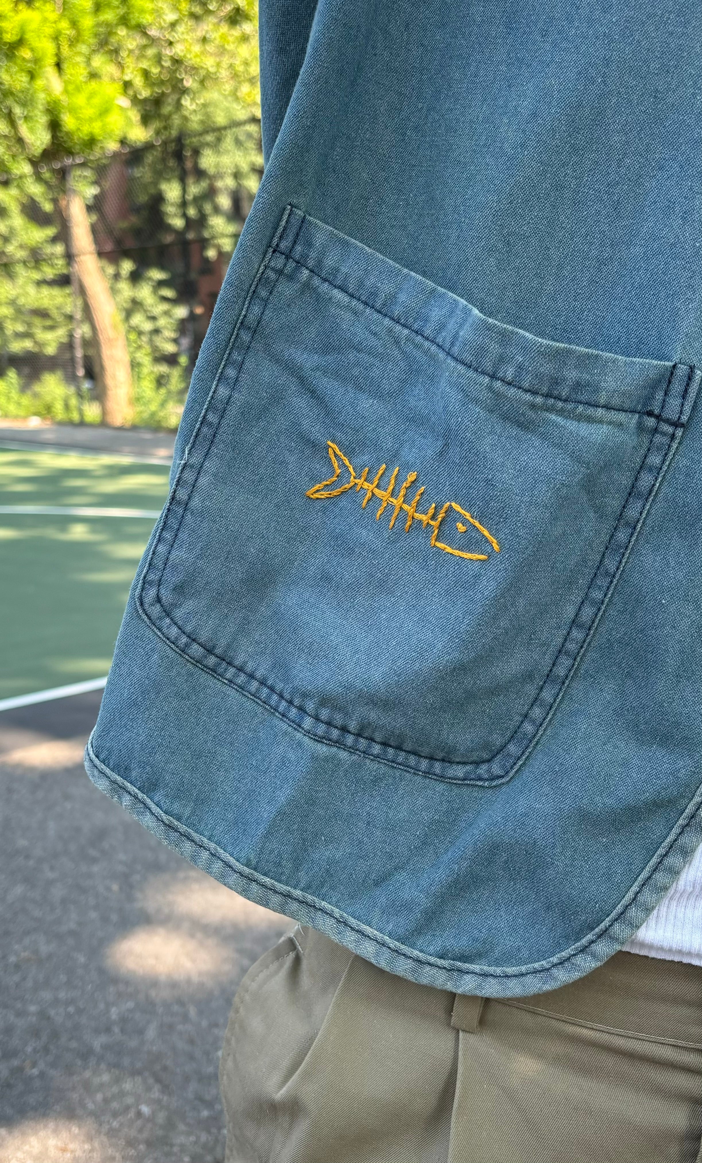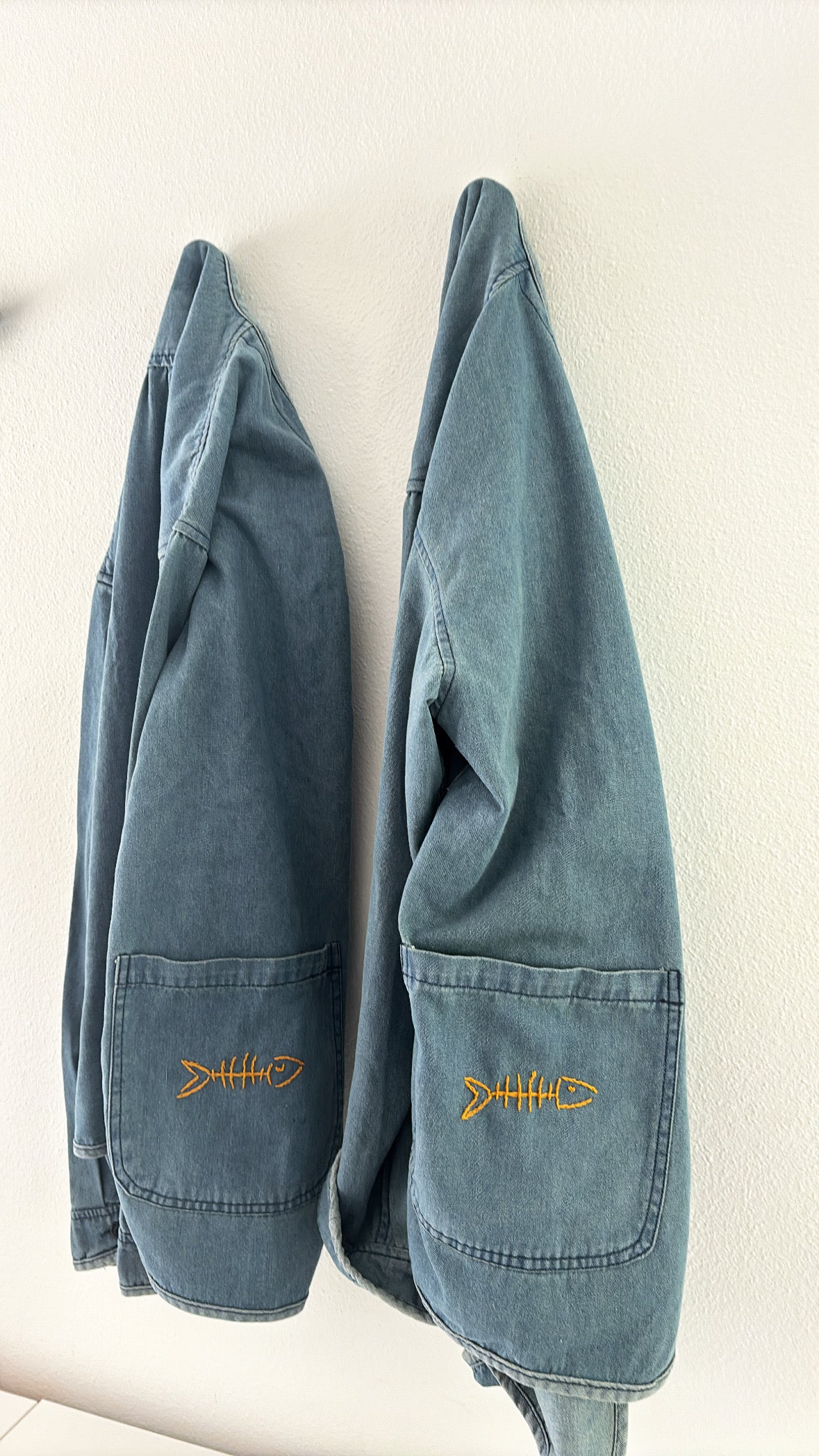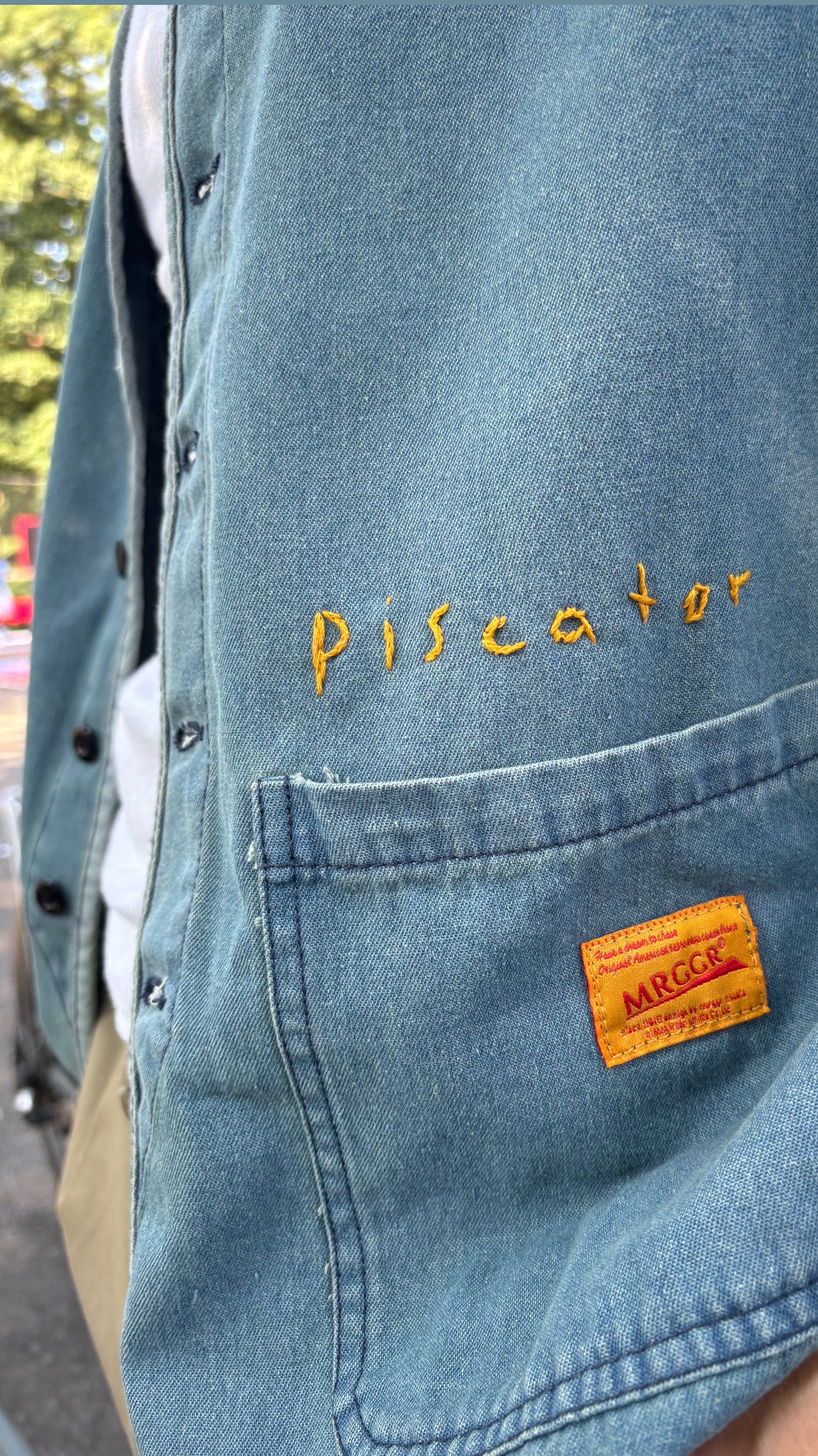 Hand-embroidered Japanese chore jacket with fish bones and Piscator's name.